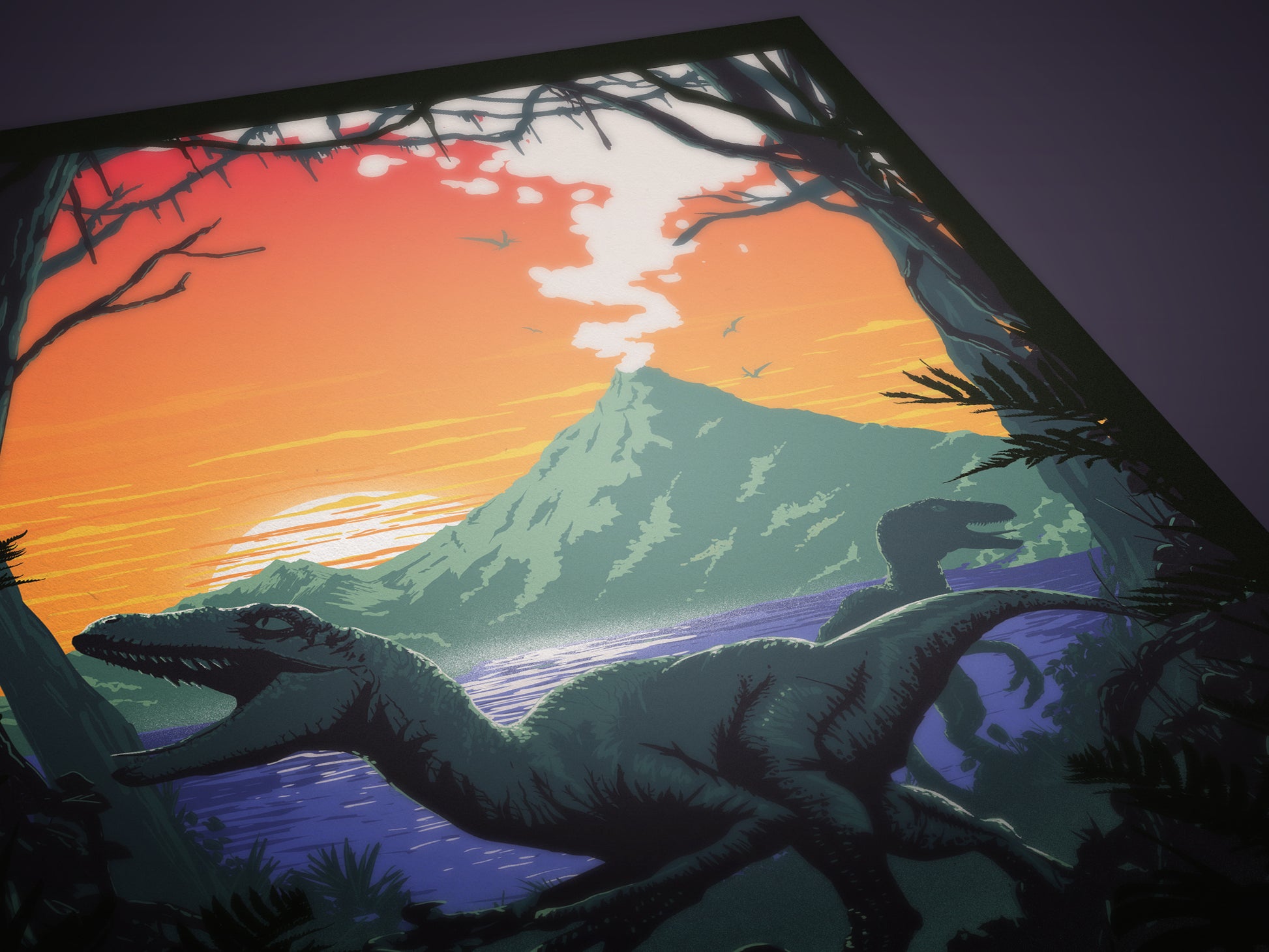 Brighten up your walls with this retro Jurassic Park inspired Travel Poster featuring the Velociraptors and the scenery of Isla Nublar. It's the perfect gift for all your Dino-fan friends.