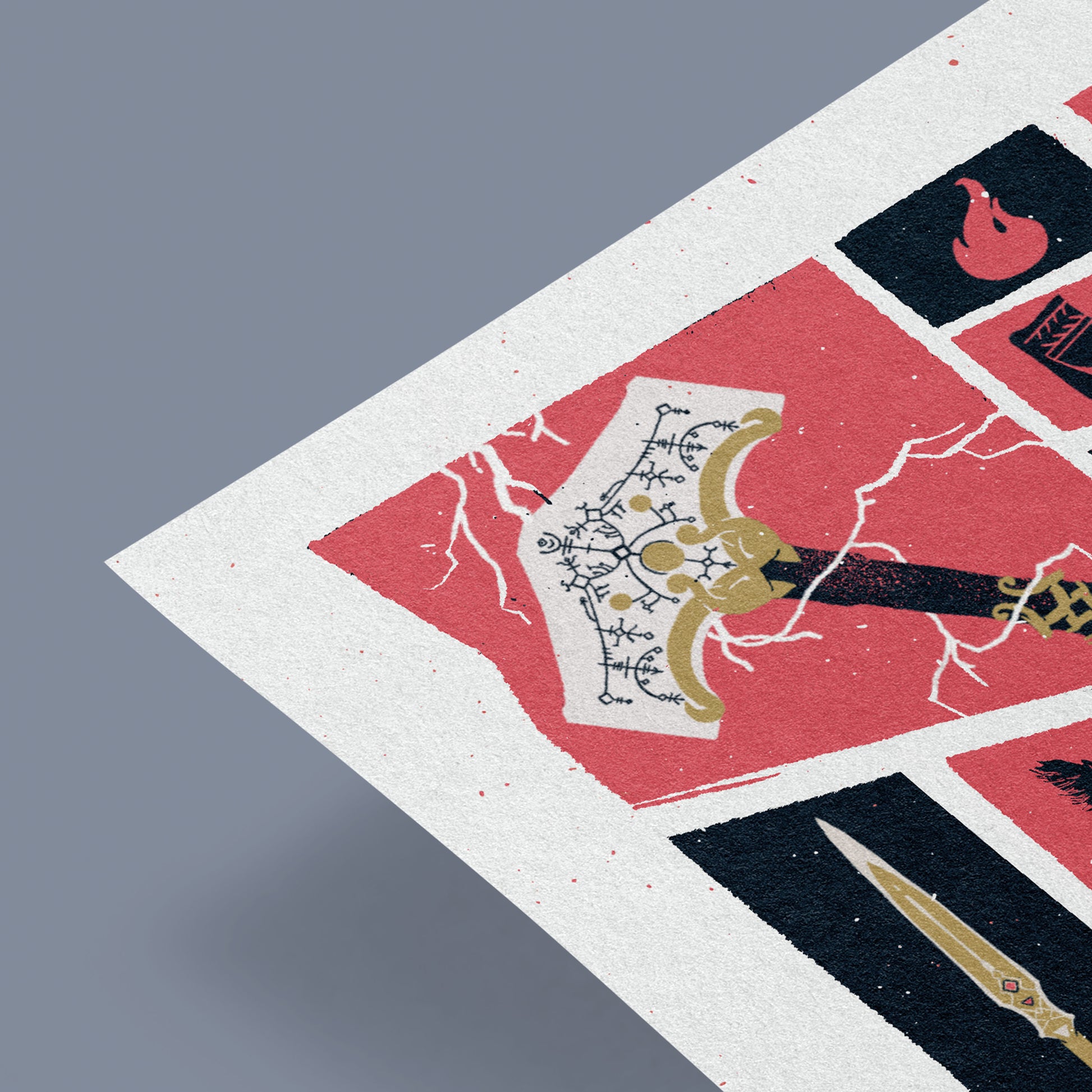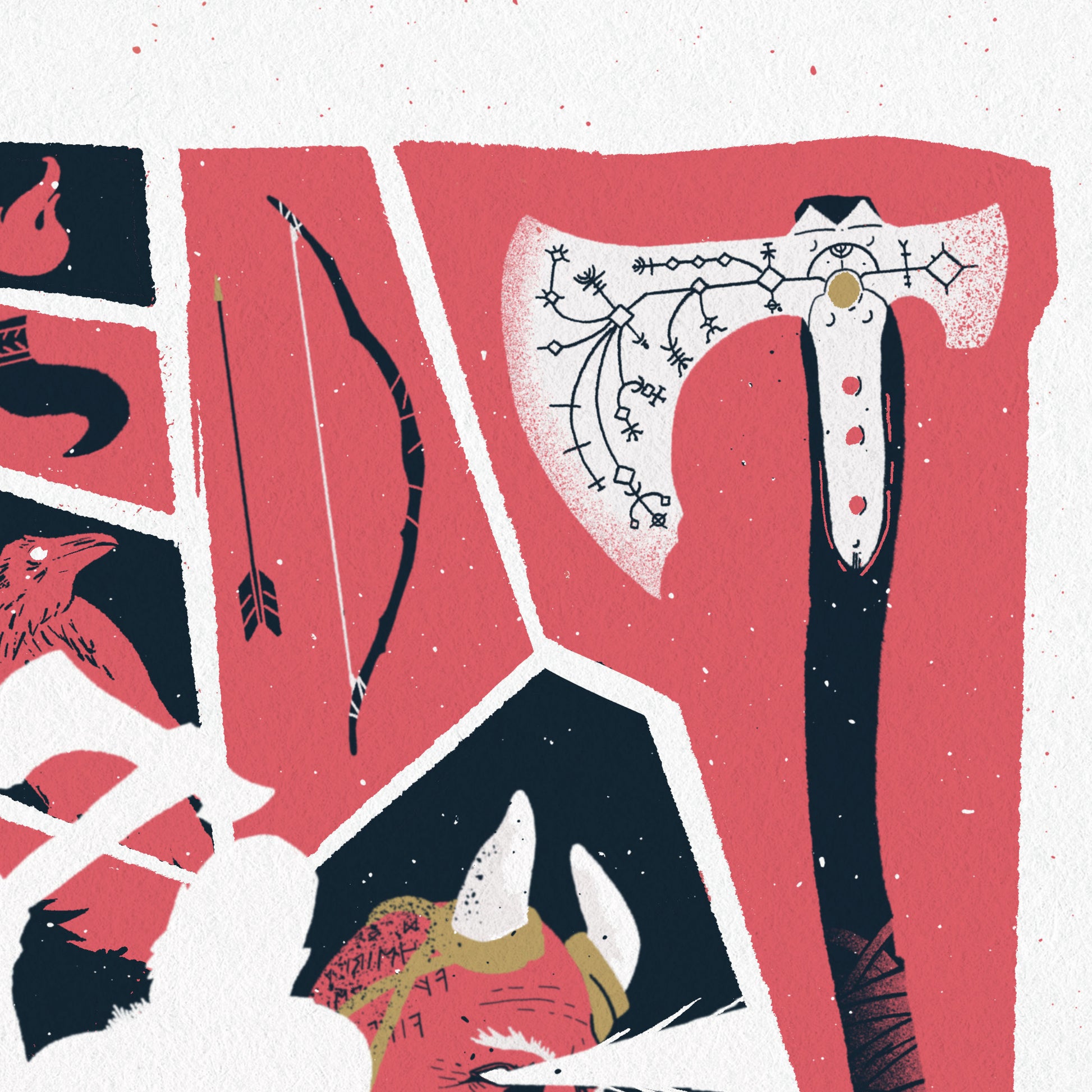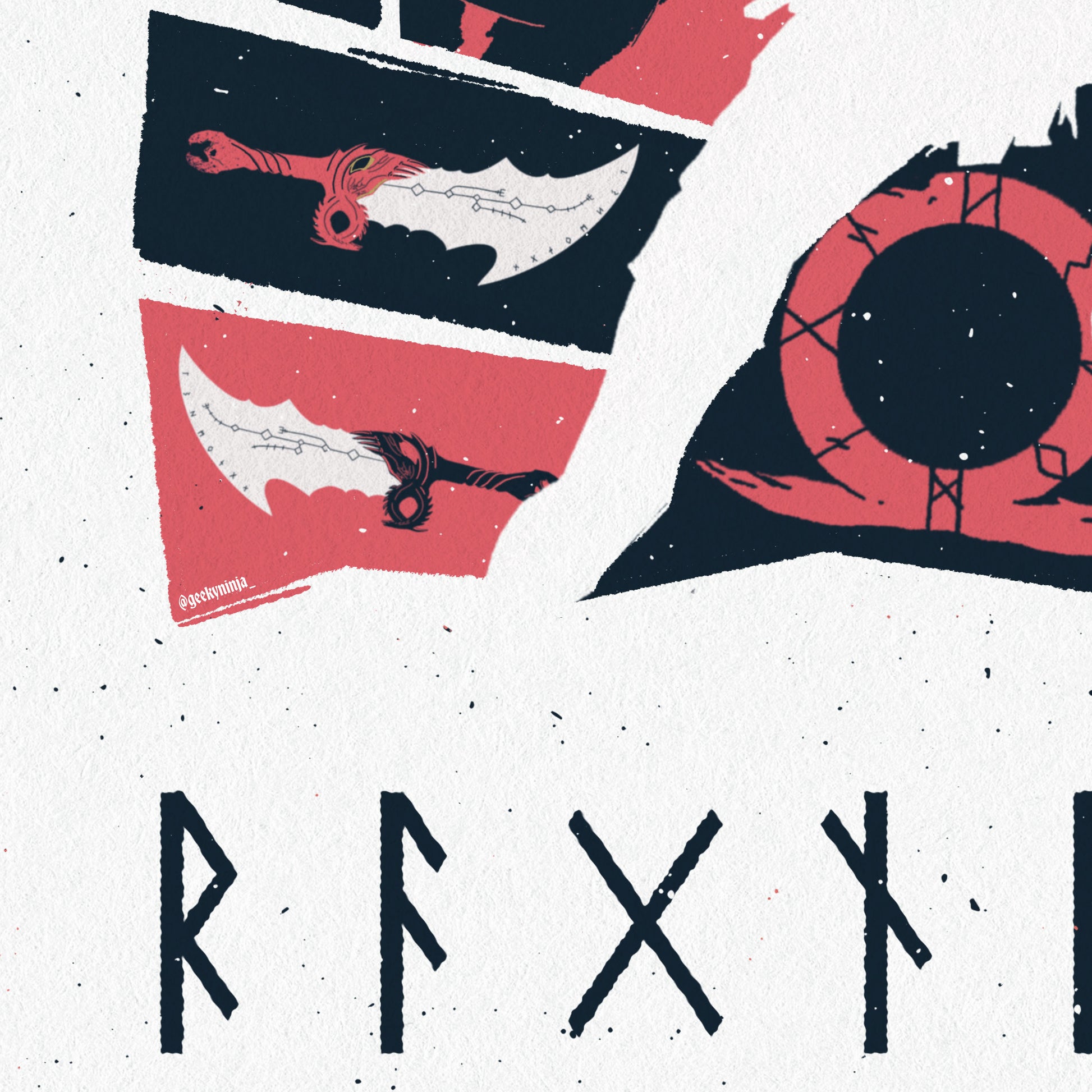 Inspired by the popular video game God of War; Ragnarok. This striking design showcases a selectioon of the elements that made the game so memorable.
