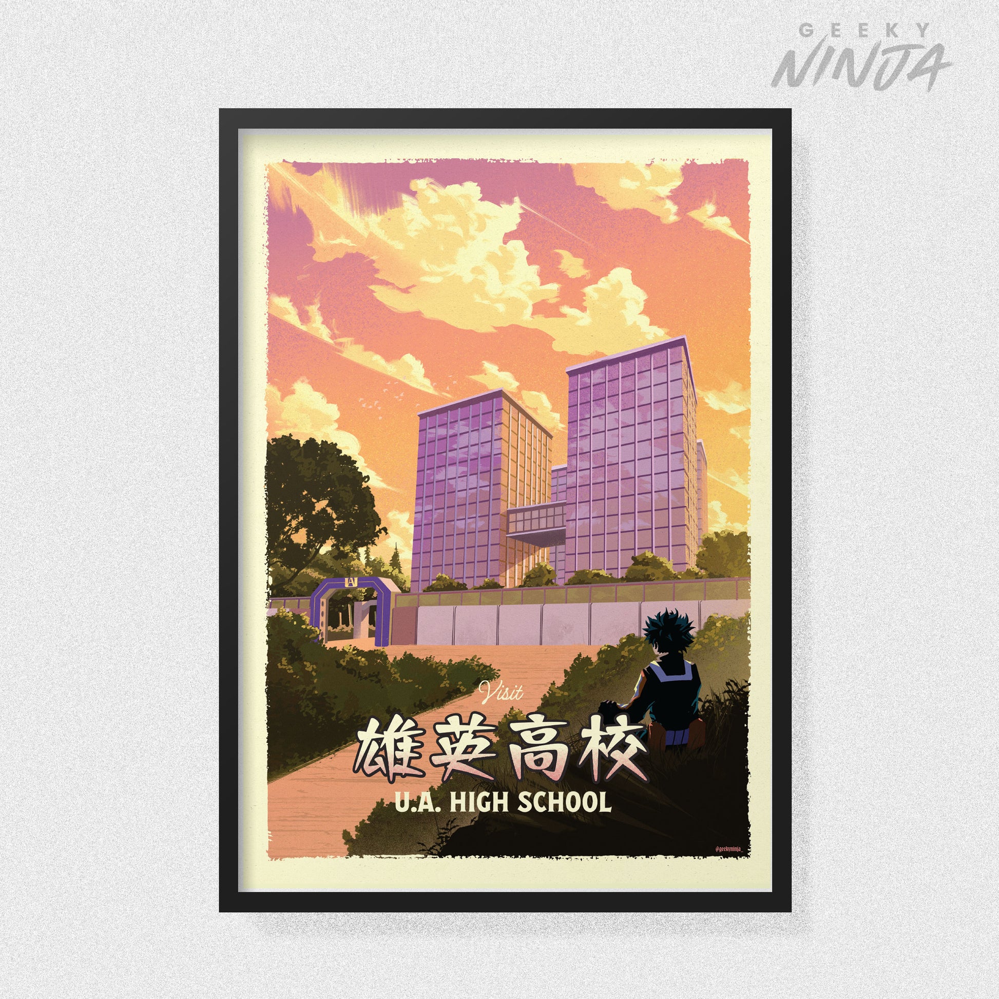 Inspired by the popular anime featuring Deku looking over U.A. High School, this stunning design is the perfect print or unique gift for a My Hero Academia fan